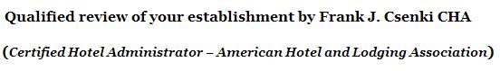 * Return Factor . There will also be a written commentary on the overall dining and guest stay experience. ( Review method will be your choice – Blind Review or Preplanned Announced Reviewallowing you to prepare )